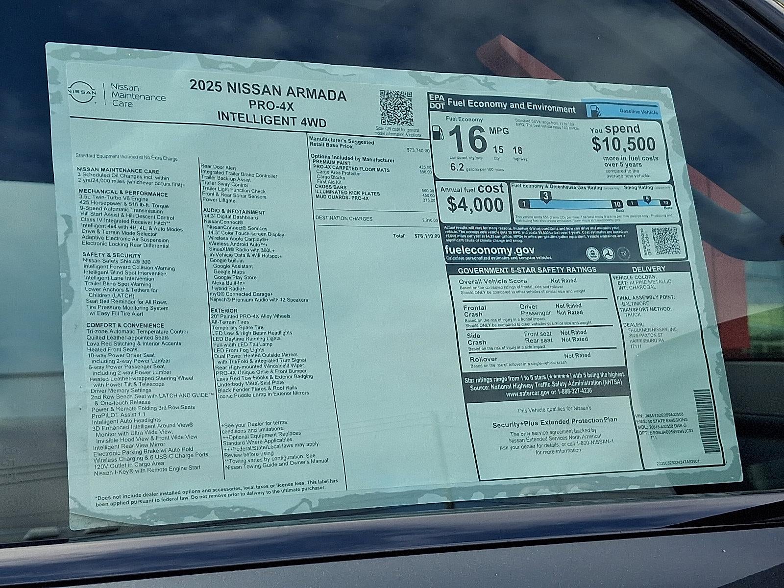 2025 Nissan Armada PRO-4X 3.5L DOHC *Schedule a test Drive at your home or office*, 4WD, 12 Speakers, 3rd row seats: split-bench, 4-Wheel Disc Brakes, ABS brakes, Adaptive suspension, Air Conditioning, Alloy wheels, AM/FM radio: SiriusXM, Anti-whiplash front head restraints, Auto High-beam Headlights, Auto tilt-away steering wheel, Auto-dimming door mirrors, Auto-dimming Rear-View mirror, Auto-leveling suspension, Automatic temperature control, Brake assist, Bumpers: body-color, Delay-off headlights, Driver door bin, Driver vanity mirror, Dual front impact airbags, Dual front side impact airbags, Electronic Stability Control, Emergency communication system: NissanConnect Services, Four wheel independent suspension, Front anti-roll bar, Front Bucket Seats, Front Center Armrest, Front dual zone A/C, Front fog lights, Front reading lights, Front Tow Hooks, Fully automatic headlights, Garage door transmitter: myQ Connected Garage, Genuine wood dashboard insert, Heated door mirrors, Heated Front Bucket Seats, Heated front seats, Heated steering wheel, HVAC memory, Illuminated entry, Illuminated Kick Plates, Knee airbag, Leather steering wheel, Low tire pressure warning, Memory seat, Navigation System, Occupant sensing airbag, Outside temperature display, Overhead airbag, Overhead console, Panic alarm, Passenger door bin, Passenger vanity mirror, Power door mirrors, Power driver seat, Power Liftgate, Power passenger seat, Power steering, Power windows, Premium Paint, PRO-4X Carpeted Floor Mats, PRO-4X Mud Guards, PRO-4X Unique Quilted Leather Seat Trim, Radio: NissanConnect w/SiriusXM 360L, Rain sensing wipers, Rear air conditioning, Rear anti-roll bar, Rear reading lights, Rear seat center armrest, Rear window defroster, Rear window wiper, Reclining 3rd row seat, Remote keyless entry, Roof Rail Cross Bars, Security system, Speed control, Speed-sensing steering, Speed-Sensitive Wipers, Split folding rear seat, Spoiler, Steering wheel memory, Steering wheel mounted audio controls, Tachometer, Telescoping steering wheel, Tilt steering wheel, Traction control, Trip computer, Turn signal indicator mirrors, Variably intermittent wipers, Voltmeter, Wheels: 20" Painted PRO-4X Alloy, 4WD.