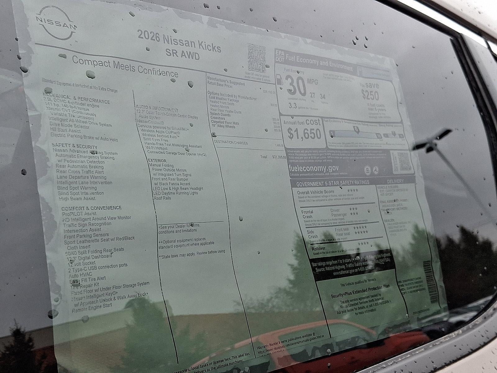 2026 Nissan Kicks SR 2.0L DOHC *Schedule a test Drive at your home or office*, 17" Alloy Wheels, 19" Alloy Wheels, 4-Wheel Disc Brakes, 6 Speakers, ABS brakes, Air Conditioning, Alloy wheels, AM/FM radio, Auto High-beam Headlights, Automatic temperature control, Brake assist, Bumpers: body-color, Carpeted Floor Mats, Cold Weather Package, Crossbars, Delay-off headlights, Driver door bin, Driver vanity mirror, Dual front impact airbags, Dual front side impact airbags, Electronic Stability Control, Emergency communication system: NissanConnect Services, Exterior Parking Camera Rear, Four wheel independent suspension, Front anti-roll bar, Front Bucket Seats, Front Center Armrest, Front reading lights, Fully automatic headlights, Garage door transmitter: myQ Connected Garage, Heated Front Seats, Heated Mirrors, Illuminated entry, Knee airbag, Leather Shift Knob, Leather steering wheel, Low tire pressure warning, NissanConnect featuring Apple CarPlay and Android Auto, Occupant sensing airbag, Outside temperature display, Overhead airbag, Overhead console, Panic alarm, Passenger door bin, Passenger vanity mirror, Power door mirrors, Power steering, Power windows, Radio data system, Radio: AM/FM/SiriusXM Audio System, Rear anti-roll bar, Rear Floor Heater Ducts, Rear reading lights, Rear seat center armrest, Rear side impact airbag, Rear window defroster, Rear window wiper, Remote keyless entry, Security system, Speed control, Speed-sensing steering, Splash Guards, Split folding rear seat, Spoiler, Sport Leatherette w/Cloth Insert Seat Trim, Sport steering wheel, Steering wheel mounted audio controls, Tachometer, Telescoping steering wheel, Tilt steering wheel, Traction control, Trip computer, Turn signal indicator mirrors, Variably intermittent wipers.