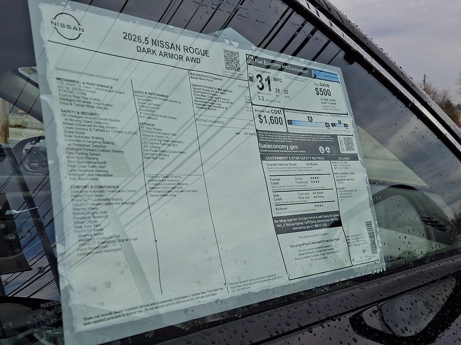Recent Arrival! 2026 Nissan Rogue Dark Armor 1.5L DOHC *Schedule a test Drive at your home or office*, AWD, 4-Wheel Disc Brakes, 6 Speakers, ABS brakes, Air Conditioning, Alloy wheels, AM/FM radio, Apple CarPlay/Android Auto, Auto High-beam Headlights, Automatic temperature control, Black Splash Guards (set of 4), Brake assist, Bumpers: body-color, Delay-off headlights, Driver door bin, Driver vanity mirror, Dual front impact airbags, Dual front side impact airbags, Electronic Stability Control, Emergency communication system: NissanConnect Services, Exterior Parking Camera Rear, Floor Mats with 1-Piece Cargo Area Protector, Four wheel independent suspension, Frameless Rearview Mirror with Universal Remote, Front anti-roll bar, Front Bucket Seats, Front Center Armrest, Front dual zone A/C, Front reading lights, Fully automatic headlights, Heated door mirrors, Heated Front Bucket Seats, Heated front seats, Heated steering wheel, Illuminated entry, Illuminated Kick Plates, Knee airbag, Low tire pressure warning, Occupant sensing airbag, Outside temperature display, Overhead airbag, Overhead console, Panic alarm, Passenger door bin, Passenger vanity mirror, Power door mirrors, Power driver seat, Power Liftgate, Power moonroof, Power steering, Power windows, Prima-Tex Leatherette Seat Trim, Radio data system, Radio: AM/FM NissanConnect, Rear anti-roll bar, Rear Parking Sensors, Rear reading lights, Rear seat center armrest, Rear side impact airbag, Rear window defroster, Rear window wiper, Remote keyless entry, Retractable Cargo Cover, Speed control, Speed-sensing steering, Speed-Sensitive Wipers, Split folding rear seat, Spoiler, Steering wheel mounted audio controls, Tachometer, Telescoping steering wheel, Tilt steering wheel, Traction control, Trip computer, Variably intermittent wipers, Wheels: 19" Black Painted and Machine Finished Alloy, AWD.