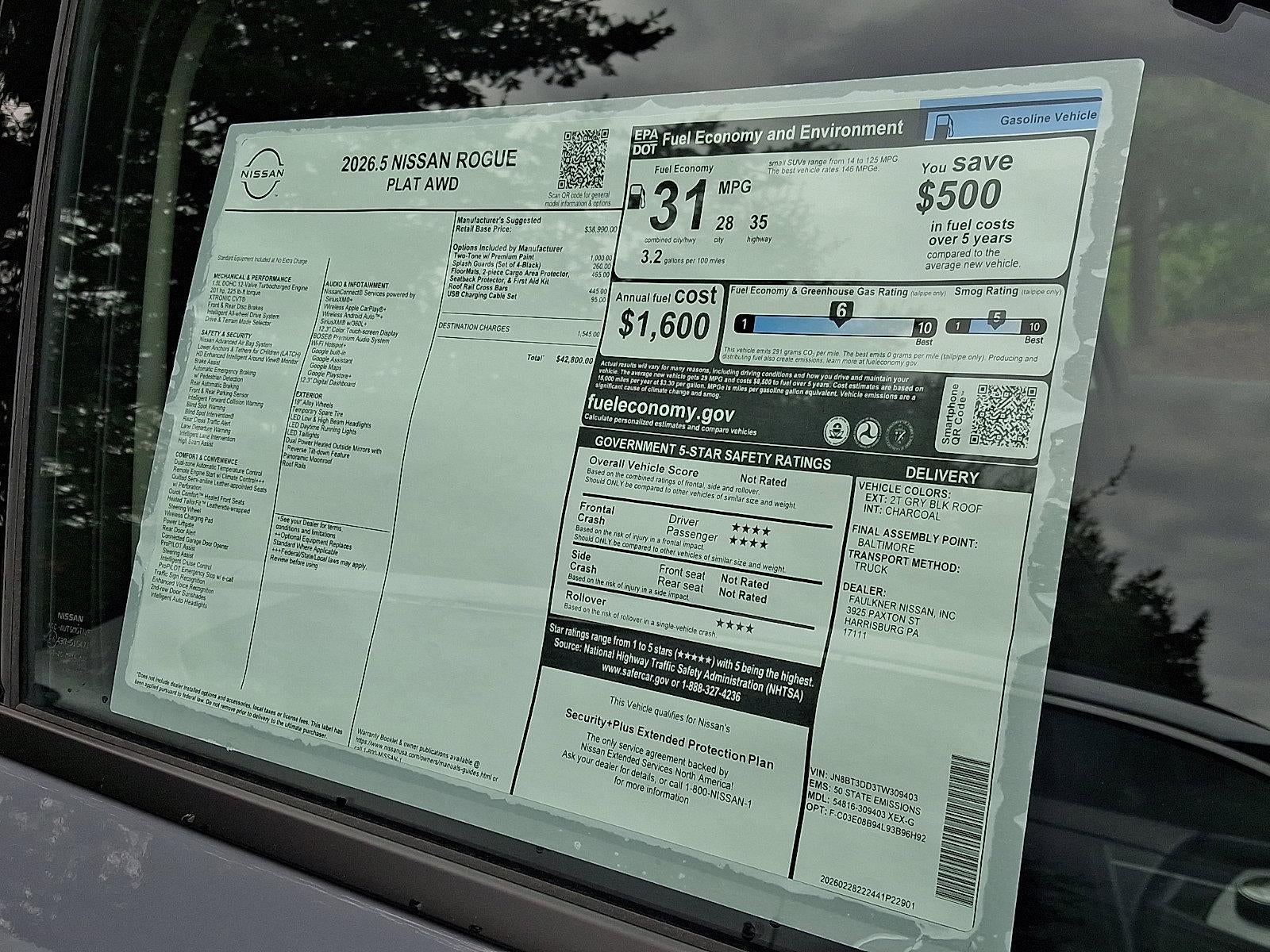 2026 Nissan Rogue Platinum 1.5L DOHC *Schedule a test Drive at your home or office*, AWD, 10 Speakers, 4-Wheel Disc Brakes, ABS brakes, Air Conditioning, Alloy wheels, AM/FM radio: SiriusXM w/360L, Auto High-beam Headlights, Auto-dimming Rear-View mirror, Automatic temperature control, Black Splash Guards (set of 4), Bose Premium Audio System, Brake assist, Bumpers: body-color, Delay-off headlights, Driver door bin, Driver vanity mirror, Dual front impact airbags, Dual front side impact airbags, Electronic Stability Control, Emergency communication system: NissanConnect Services, First Aid Kit, Floor Mats with 2-Piece Cargo Area Protector, Four wheel independent suspension, Front anti-roll bar, Front Bucket Seats, Front Center Armrest, Front dual zone A/C, Front reading lights, Fully automatic headlights, Garage door transmitter: myQ Connected Garage, Heated door mirrors, Heated Front Bucket Seats, Heated front seats, Heated steering wheel, Illuminated entry, Knee airbag, Low tire pressure warning, Memory seat, Navigation system: Google Maps, Occupant sensing airbag, Outside temperature display, Overhead airbag, Overhead console, Panic alarm, Passenger door bin, Passenger vanity mirror, Power door mirrors, Power driver seat, Power Liftgate, Power moonroof, Power passenger seat, Power steering, Power windows, Premium Paint with Two-Tone, Quilted Semi-Aniline Leather-Appointed Seat Trim, Radio data system, Radio: AM/FM NissanConnect with Navigation, Rear anti-roll bar, Rear reading lights, Rear seat center armrest, Rear side impact airbag, Rear window defroster, Rear window wiper, Remote keyless entry, Roof Rail Cross Bars, Security system, Speed control, Speed-sensing steering, Speed-Sensitive Wipers, Split folding rear seat, Spoiler, Steering wheel mounted audio controls, Tachometer, Telescoping steering wheel, Tilt steering wheel, Traction control, Trip computer, Turn signal indicator mirrors, USB Charging Cable Set, Variably intermittent wipers, Wheels: 19" Unique Dark Painted Aluminum Alloy, Wireless Apple CarPlay/Wireless Android Auto, AWD.
