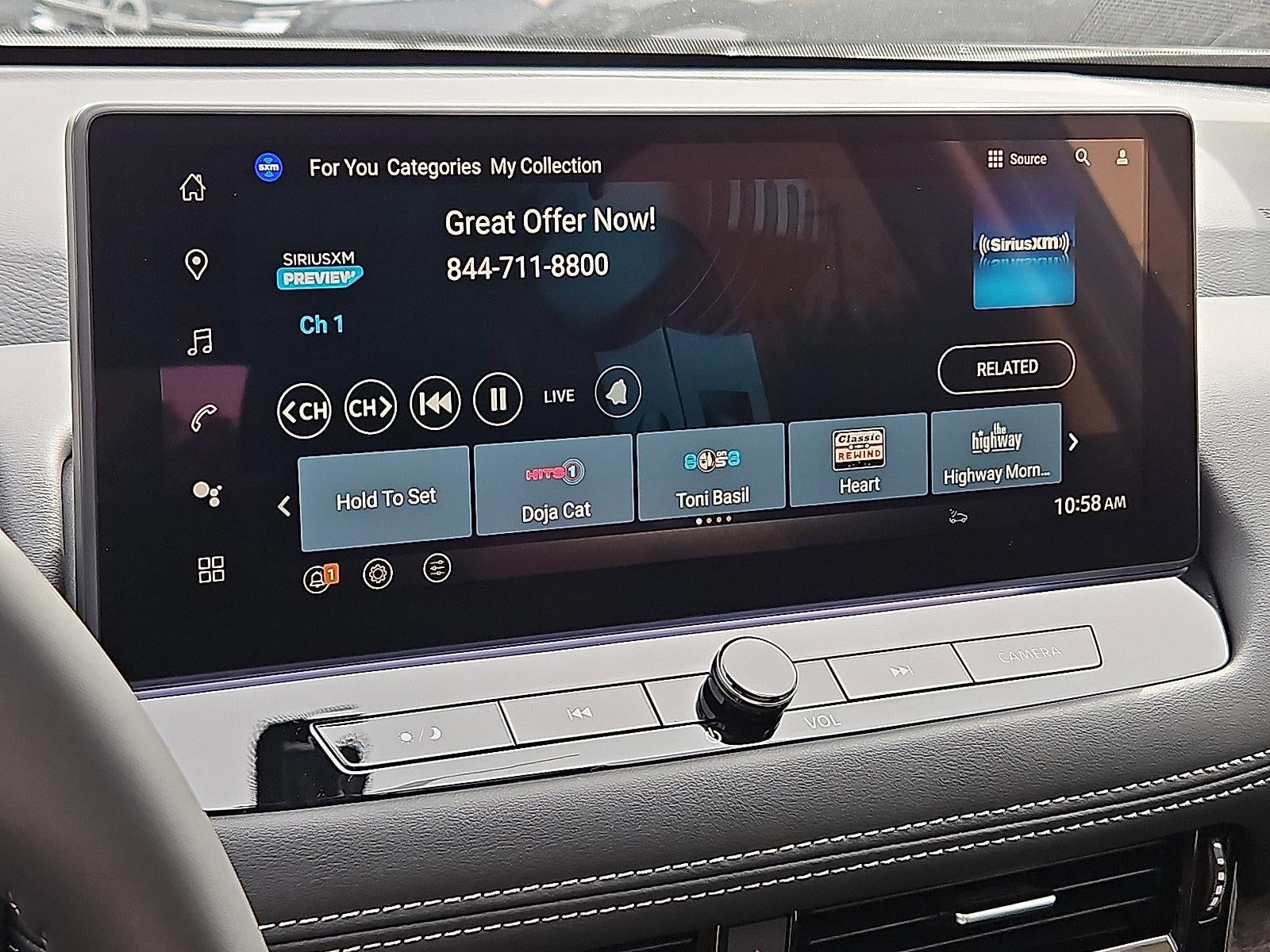 - Radio: AM/FM NissanConnect w/Navigation -inc: SiriusXM 360L, hybrid radio, enhanced voice recognition (one shot VDE, natural language understanding), Active Noise Cancellation, wireless Apple CarPlay, wireless Android Auto, 12.3" color HD display, Bluetooth®, 2 front USB type-C, Wi-Fi hotspot, Alexa Built-In, Google built-in: Google Assistant, Play Store, maps, data, NissanConnect Services powered by SiriusXM, SiriusXM Traffic and SiriusXM Travel Link