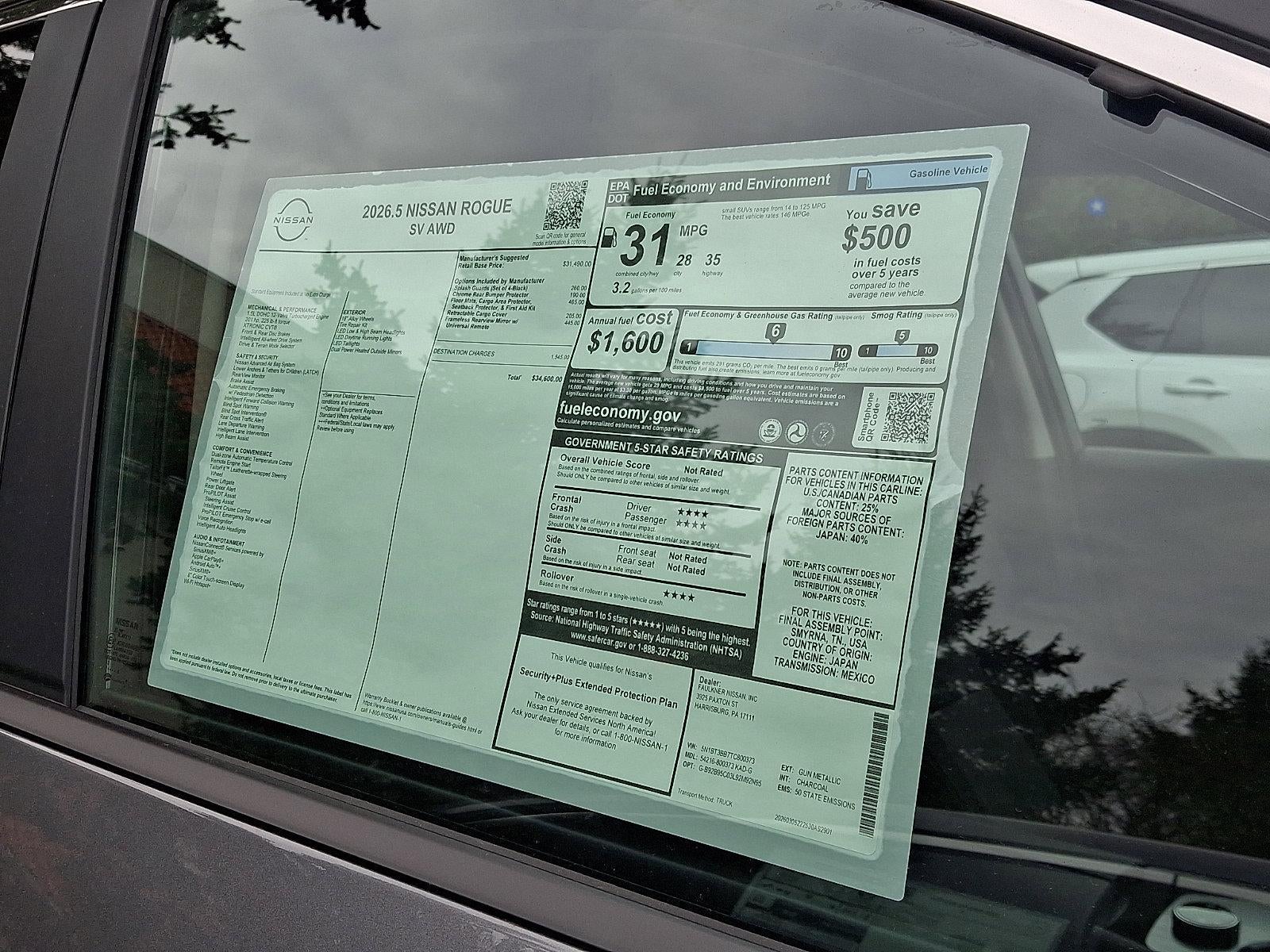 2026 Nissan Rogue SV 1.5L DOHC *Schedule a test Drive at your home or office*, AWD, 4-Wheel Disc Brakes, 6 Speakers, ABS brakes, Air Conditioning, Alloy wheels, AM/FM radio, Apple CarPlay/Android Auto, Auto High-beam Headlights, Automatic temperature control, Black Splash Guards (set of 4), Brake assist, Bumpers: body-color, Chrome Rear Bumper Protector, Cloth Seat Trim with Patterned Inserts, Delay-off headlights, Driver door bin, Driver vanity mirror, Dual front impact airbags, Dual front side impact airbags, Electronic Stability Control, Emergency communication system: NissanConnect Services, Floor Mats with 1-Piece Cargo Area Protector, Four wheel independent suspension, Frameless Rearview Mirror with Universal Remote, Front anti-roll bar, Front Bucket Seats, Front Center Armrest, Front dual zone A/C, Front reading lights, Fully automatic headlights, Heated door mirrors, Illuminated entry, Knee airbag, Low tire pressure warning, Occupant sensing airbag, Outside temperature display, Overhead airbag, Overhead console, Panic alarm, Passenger door bin, Passenger vanity mirror, Power door mirrors, Power driver seat, Power Liftgate, Power steering, Power windows, Radio data system, Radio: AM/FM NissanConnect, Rear anti-roll bar, Rear seat center armrest, Rear side impact airbag, Rear window defroster, Rear window wiper, Remote keyless entry, Retractable Cargo Cover, Speed control, Speed-sensing steering, Speed-Sensitive Wipers, Split folding rear seat, Spoiler, Steering wheel mounted audio controls, Tachometer, Telescoping steering wheel, Tilt steering wheel, Traction control, Trip computer, Variably intermittent wipers, AWD.