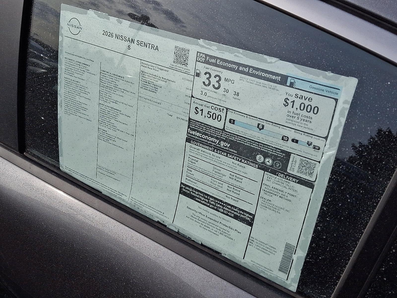 2026 Nissan Sentra S 2.0L I4 DOHC *Schedule a test Drive at your home or office*, CVT with Xtronic, Charcoal Cloth, 4 Speakers, 4-Wheel Disc Brakes, ABS brakes, Air Conditioning, AM/FM radio: Sirius, Auto High-beam Headlights, Body Colored Splash Guards (4-Piece), Brake assist, Bumpers: body-color, Cloth Seat Trim, Delay-off headlights, Driver door bin, Driver vanity mirror, Dual front impact airbags, Dual front side impact airbags, Electronic Stability Control, Floor Mat Package, Four wheel independent suspension, Front anti-roll bar, Front Bucket Seats, Front Center Armrest, Front reading lights, Fully automatic headlights, Heated Front Seats, Heated Mirrors, Illuminated entry, Knee airbag, Low tire pressure warning, Occupant sensing airbag, Outside temperature display, Overhead airbag, Overhead console, Panic alarm, Passenger door bin, Passenger vanity mirror, Power door mirrors, Power steering, Power windows, Radio data system, Radio: AM/FM with RDS/MP3, Rear anti-roll bar, Rear side impact airbag, Rear window defroster, Remote keyless entry, S Cold Weather Package, Speed control, Speed-sensing steering, Split folding rear seat, Steering wheel mounted audio controls, Tachometer, Telescoping steering wheel, Tilt steering wheel, Traction control, Trip computer, Variably intermittent wipers, Wheels: 16" Steel with Full Covers, Wireless Apple CarPlay/Wireless Android Auto, CVT with Xtronic, Charcoal Cloth.