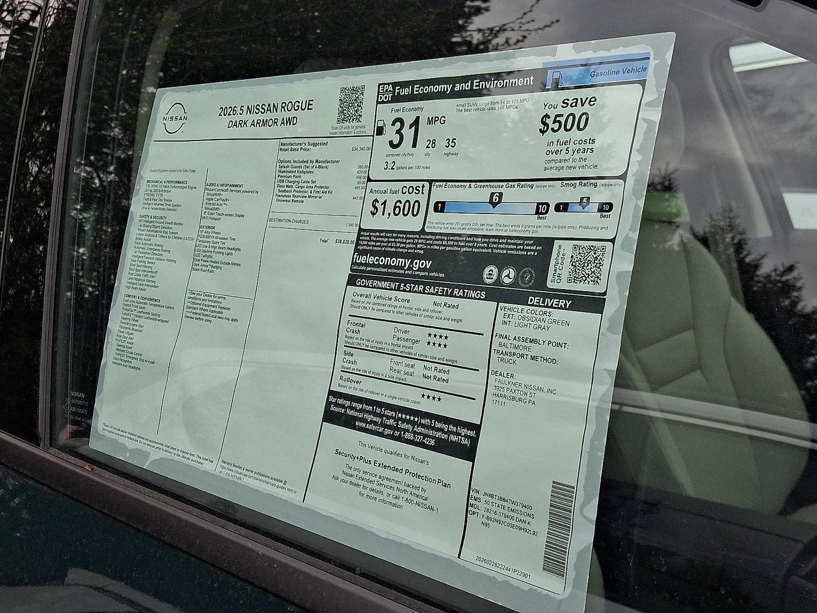 2026 Nissan Rogue Dark Armor 1.5L DOHC *Schedule a test Drive at your home or office*, AWD, 4-Wheel Disc Brakes, 6 Speakers, ABS brakes, Air Conditioning, Alloy wheels, AM/FM radio, Apple CarPlay/Android Auto, Auto High-beam Headlights, Automatic temperature control, Black Splash Guards (set of 4), Brake assist, Bumpers: body-color, Delay-off headlights, Driver door bin, Driver vanity mirror, Dual front impact airbags, Dual front side impact airbags, Electronic Stability Control, Emergency communication system: NissanConnect Services, Exterior Parking Camera Rear, Floor Mats with 1-Piece Cargo Area Protector, Four wheel independent suspension, Frameless Rearview Mirror with Universal Remote, Front anti-roll bar, Front Bucket Seats, Front Center Armrest, Front dual zone A/C, Front reading lights, Fully automatic headlights, Heated door mirrors, Heated Front Bucket Seats, Heated front seats, Heated steering wheel, Illuminated entry, Illuminated Kick Plates, Knee airbag, Low tire pressure warning, Occupant sensing airbag, Outside temperature display, Overhead airbag, Overhead console, Panic alarm, Passenger door bin, Passenger vanity mirror, Power door mirrors, Power driver seat, Power Liftgate, Power moonroof, Power steering, Power windows, Premium Paint, Prima-Tex Leatherette Seat Trim, Radio data system, Radio: AM/FM NissanConnect, Rear anti-roll bar, Rear Parking Sensors, Rear reading lights, Rear seat center armrest, Rear side impact airbag, Rear window defroster, Rear window wiper, Remote keyless entry, Speed control, Speed-sensing steering, Speed-Sensitive Wipers, Split folding rear seat, Spoiler, Steering wheel mounted audio controls, Tachometer, Telescoping steering wheel, Tilt steering wheel, Traction control, Trip computer, USB Charging Cable Set, Variably intermittent wipers, Wheels: 19" Black Painted and Machine Finished Alloy, AWD.